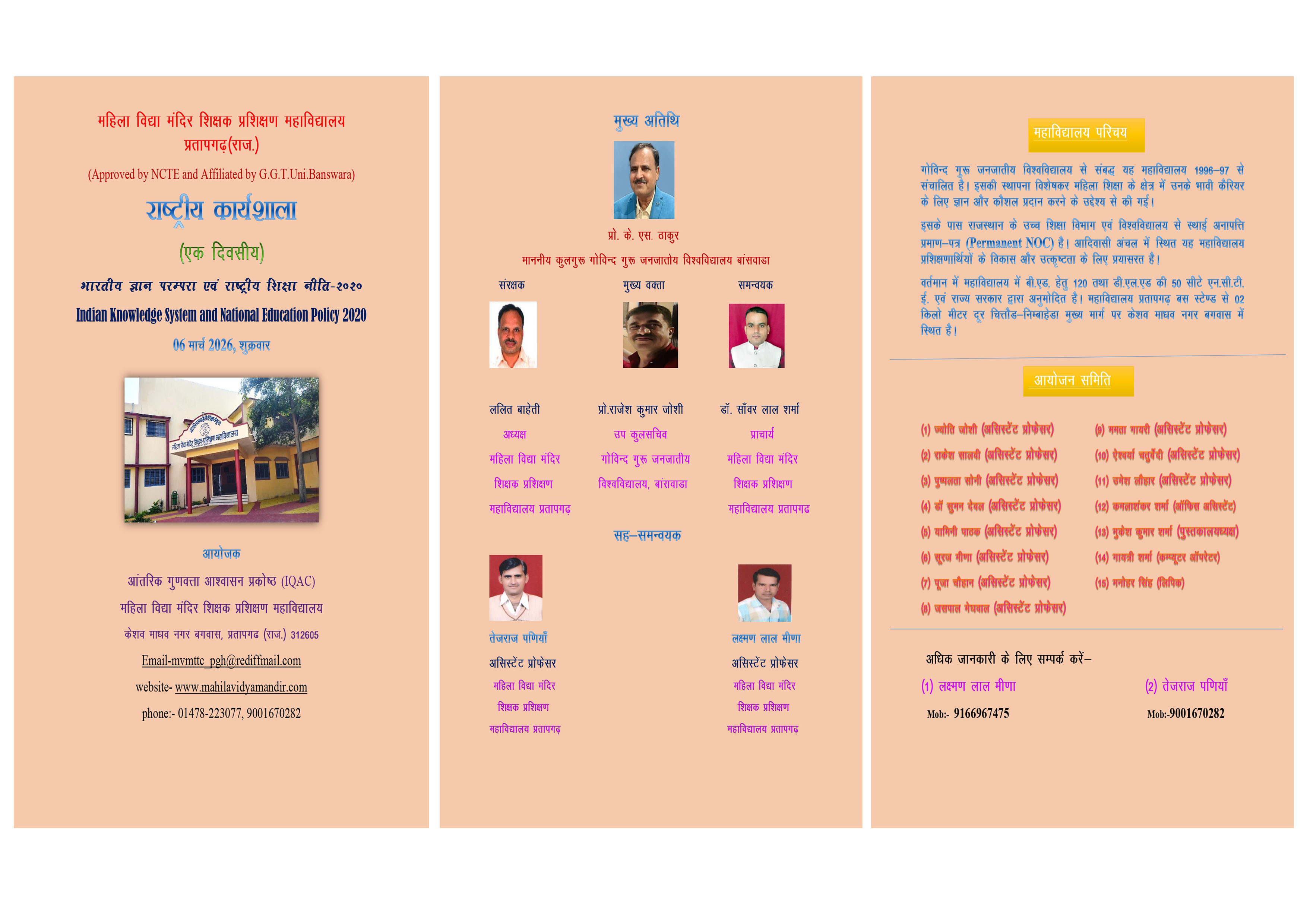 | A one-day workshop on "Indian Knowledge System and National Education Policy 2020" is being organized at the college on 06/03/2026. The chief guest will be the Honorable Vice Chancellor, Prof. K.S. Thakur and the keynote speaker will be Prof. Rajesh Kumar Joshi, Govind Guru Tribal University, Banswara. The program's patron will be Mr. Lalit Bahti, President and Principal of Mahila V |